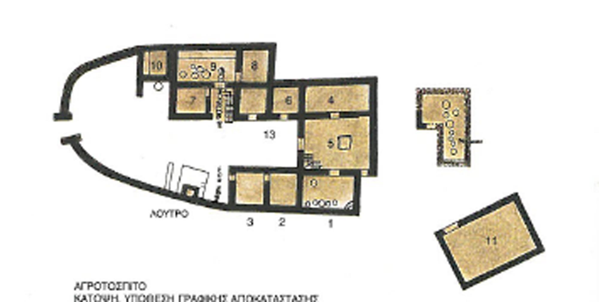 Το συγκρότημα έχει τετράγωνη κάτοψη, διαστάσεων 28,00 x 28,50 μ. Αποτελείται από τέσσερις πτέρυγες περιμετρικά, οι τρεις εκ των οποίων, πλην της νότιας, είναι διώροφες. Στο κέντρο της αγροικίας υψώνεται ένα κεντρικό διώροφο κτήριο-πύργος. Στη βόρεια και ανατολική πλευρά του συγκροτήματος διαμορφώνονται δύο μεγάλων διαστάσεων υπαίθριες αυλές, που πιθανώς φιλοξενούσαν κτηνοτροφικές δραστηριότητες (εκτροφή και σταβλισμό ζώων). Κατά την τρίτη οικοδομική φάση, στη νότια πλευρά του συγκροτήματος προστέθηκε μια σειρά από βοηθητικούς χώρους, ο ένας εκ των οποίων χρησιμοποιήθηκε σαν οπτάνιο (κουζίνα), όπως μαρτυρεί η κεντρική εστία που ανασκάφηκε εκεί. Δύο άλλοι χώροι της ίδιας επέκτασης είχαν εργαστηριακή χρήση, όπως προκύπτει από τα πολλά υπολείμματα που σχετίζονται με την επεξεργασία μετάλλων. Η εργαστηριακή δραστηριότητα διαπιστώθηκε και εκτός του συγκροτήματος, στην περιοχή ενός μεγάλου αναλημματικού τοίχου που ανασκάφηκε για συνολικό μήκος 30 μ., σε απόσταση 50 μ. από το συγκρότημα, όπου αποκαλύφθηκαν τρεις μεγάλοι κλίβανοι.