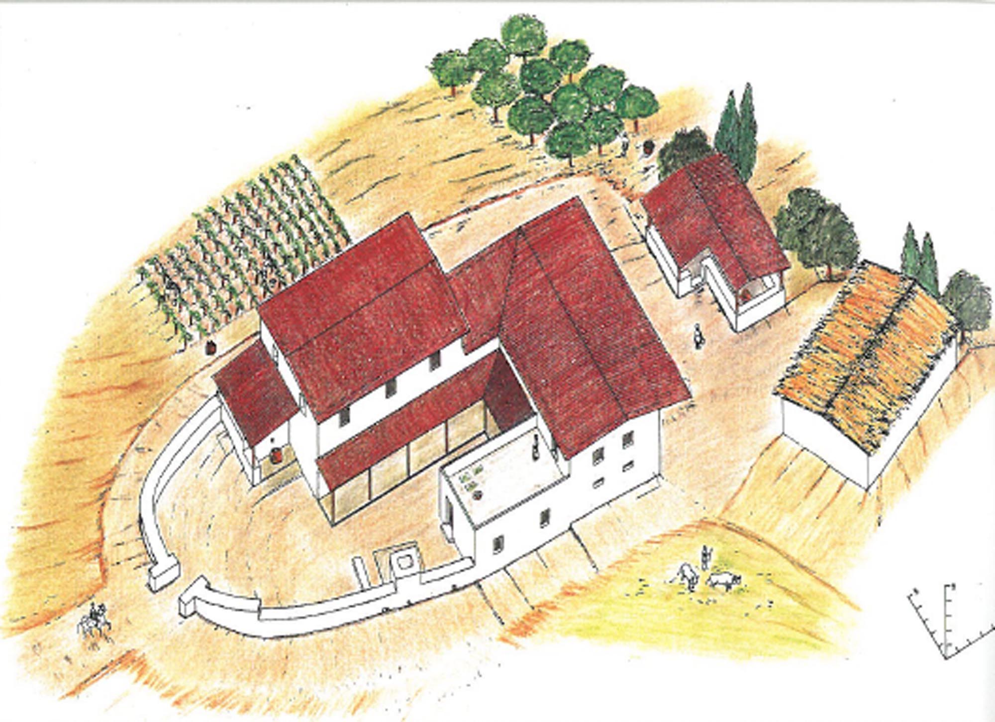 Η μορφή του συγκροτήματος, που είχε μεγάλη διάρκεια ζωής (μέσα 4ου-μέσα 6ου αι. μ.Χ.), προέκυψε ύστερα από αλλεπάλληλες προσθήκες και επιμέρους επισκευές. Στην τελική του μορφή διέθετε μία μεγάλη περίκλειστη αυλή με αψιδωτή απόληξη, μέσα στην οποία διαμορφώνονταν οι διάφοροι επιμέρους χώροι της αγροικίας, διαταγμένοι σε κάτοψη σχήματος Π. Ορισμένοι από αυτούς διέθεταν δεύτερο όροφο. Ξεχωρίζει μία μεγάλων διαστάσεων αίθουσα με κεντρική εστία για την παρασκευή φαγητού. Ένας από τους ορθογώνιους χώρους στα νοτιοδυτικά της αγροικίας ερμηνεύθηκε ως αποθήκη ωρίμανσης μούστου για οίνο, καθώς διέθετε δάπεδο από υδραυλικό κονίαμα και αγωγό απορροής υγρών. Μέσα στην αυλή βρισκόταν ένα μικρό ανεξάρτητο λουτρό. Ένα καλά οργανωμένο σύστημα αποχέτευσης με αγωγούς διοχέτευε τα νερά έξω από το συγκρότημα. Έξω από τον περίβολο του συγκροτήματος αποκαλύφθηκε μία ημιυπαίθρια αποθήκη-πιθεώνας με δέκα λαξεύματα στο χώμα για την τοποθέτηση μεγάλων πιθαριών, καθώς επίσης και ένα απομονωμένο ορθογώνιο κτίσμα που πιθανώς χρησίμευε ως στάβλος ή ιπποστάσιο.