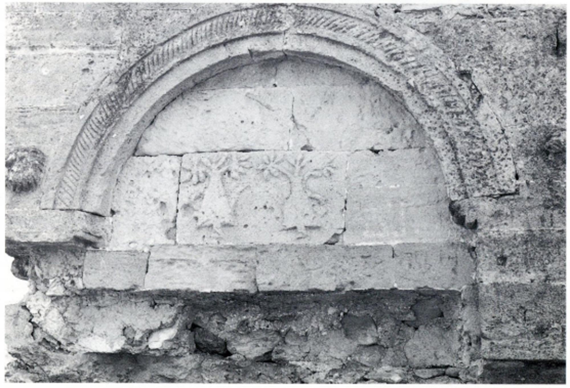 Τα δύο τόξα εγγράφονται σε ορθογώνιο πλαίσιο, που οριοθετείται στην άνω πλευρά με κυμάτιο και στις πλάγιες με κυμάτιο και ανάγλυφο σχοινίο. Το ημικυκλικό άνοιγμα των δύο τόξων πλαισιώνεται στο μέτωπό του από τρεις ταινίες σε βαθμιδωτή διάταξη, η μεσαία εκ των οποίων διακοσμείται σε όλο το μήκος της επίσης με ανάγλυφο σχοινίο. Επάνω από την κορυφή κάθε τόξου προβάλλει ένας ανάγλυφος ρόδακας, από τους οποίους σώζεται σήμερα μόνο ο ένας. Δύο εγγεγραμμένοι σε κύκλο εξάκτινοι ρόδακες έχουν χαραχθεί σε μία από τις λιθοπλίνθους αριστερά του πρώτου βόρειου τόξου. Στις βάσεις του κάθε τόξου ήταν τοποθετημένα τρία έξεργα ανάγλυφα, από τα οποία διατηρούνται σήμερα μόνο τα δύο. Σύμφωνα με τους μελετητές του μνημείου Μόσχο Οτατζή και Πέτρο Σαμσάρη, πρόκειται για λεοντοκεφαλές. Τον διάκοσμο της πρόσοψης συμπλήρωναν μέχρι την εποχή της δημοσίευσης του μνημείου από τους δύο ερευνητές (1996 και 2004) δύο λιθόπλινθοι τοποθετημένες στο κέντρο του τυμπάνου του κάθε τόξου, κάθε μία από τις οποίες έφερε δύο ανάγλυφα σχηματοποιημένα ανθοδοχεία. Σήμερα, ωστόσο, οι δύο λιθόπλινθοι έχουν αφαιρεθεί από την κρήνη. Ανάμεσα στα δύο τόξα είναι εμφανές επίσης ένα ορθογώνιο κενό, πιθανότατα από επιγραφή που έχει αφαιρεθεί.