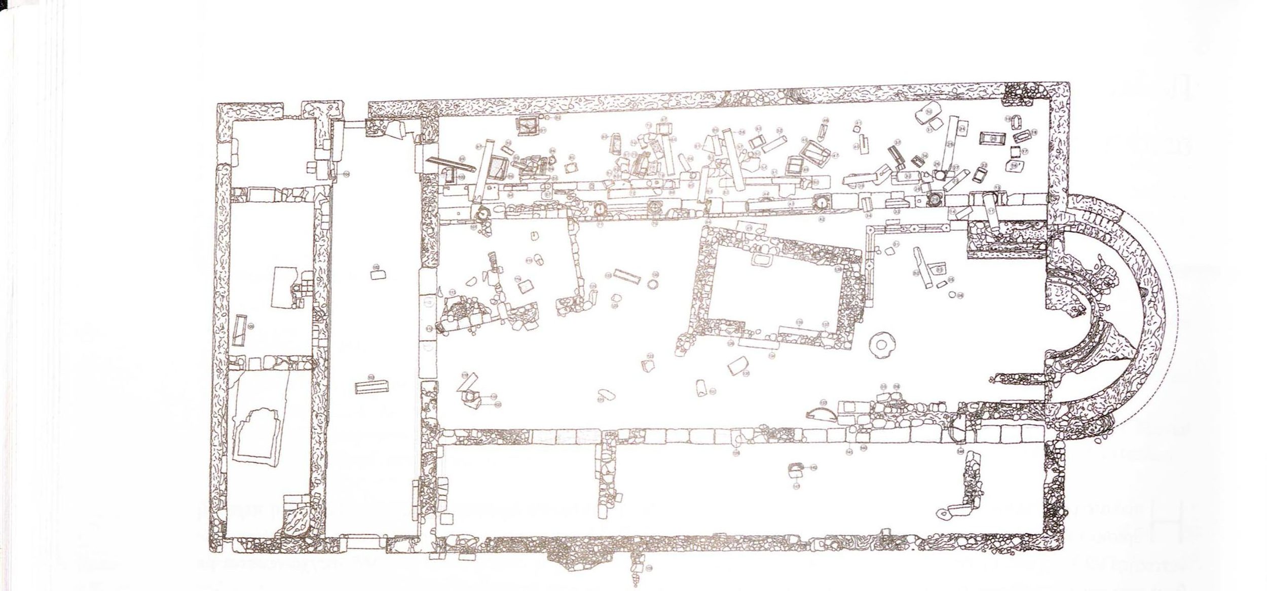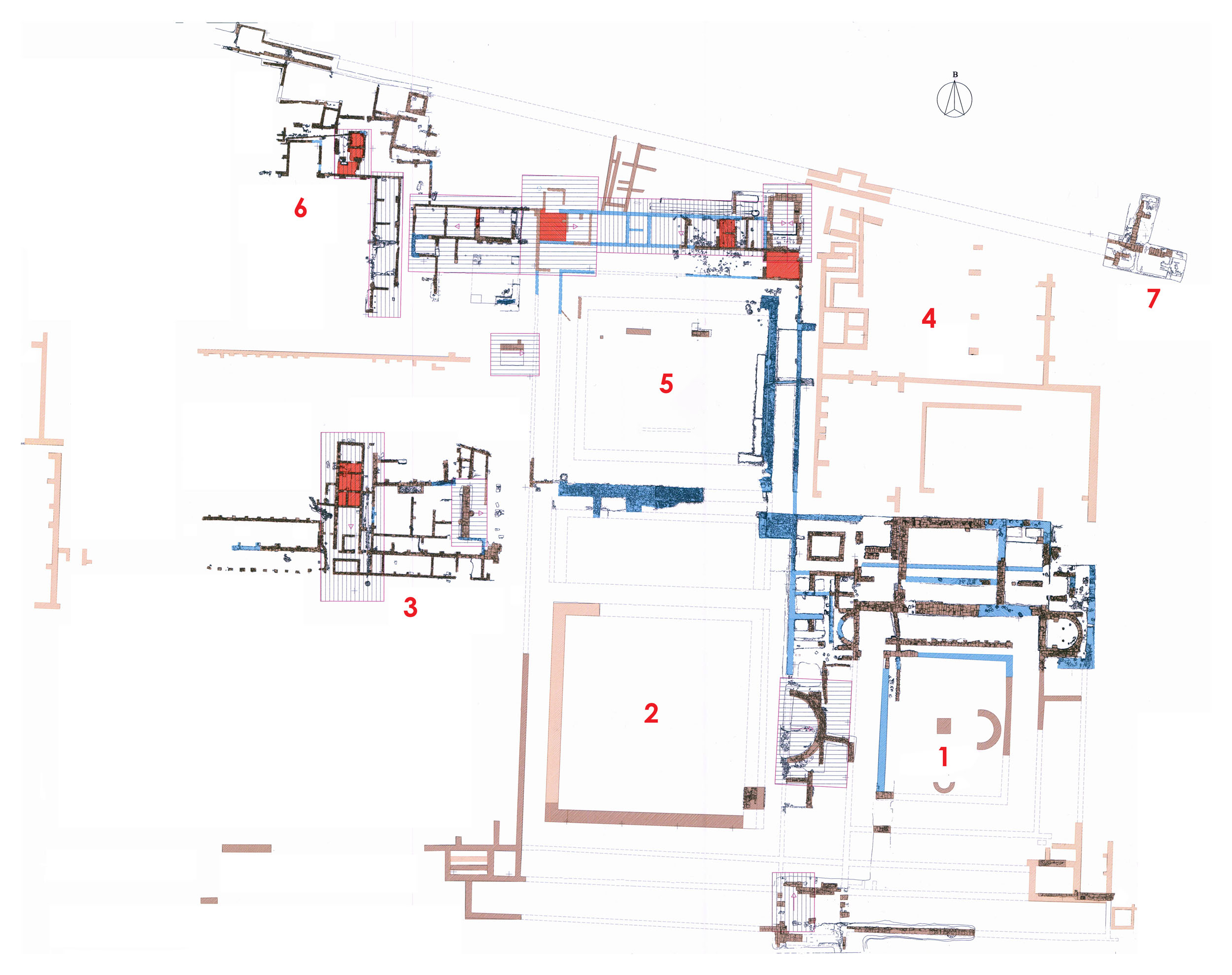 Κάτοψη του ανακτόρου: 1. Κτήριο I 2. Κτήριο II 3. Κτήριο III 4. Κτήριο ΙV 5. Κτήριο V (Παλαίστρα) 6. Κτήριο VI 7. Βασίλειος κάραβος (Πύλη – Πύργος) / Ground plan of the palace complex: 1. Building I 2. Building II 3. Building III 4. Building IV 5. Building V (Palaestra) 6. Building VI 7. Royal Gate – Tower