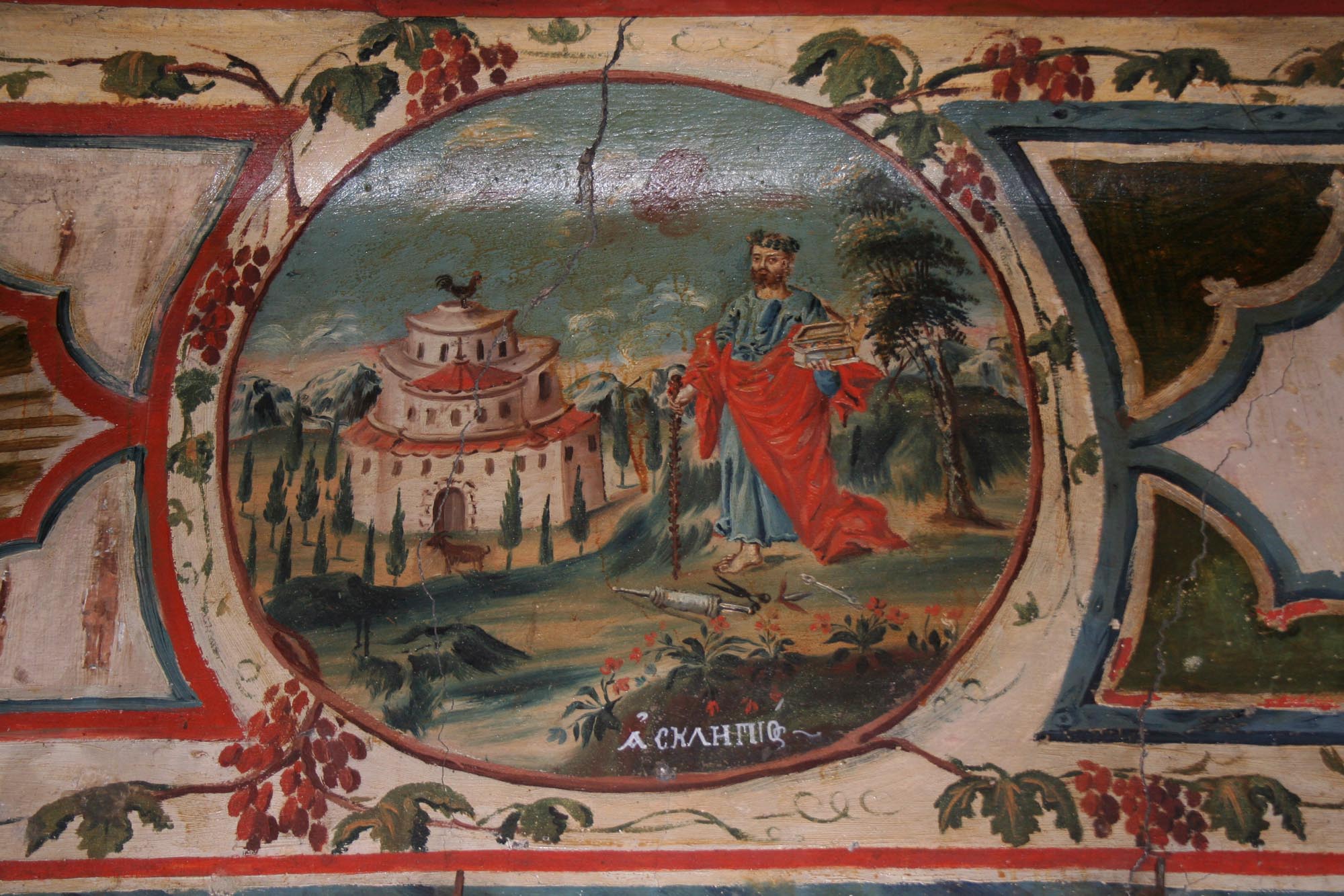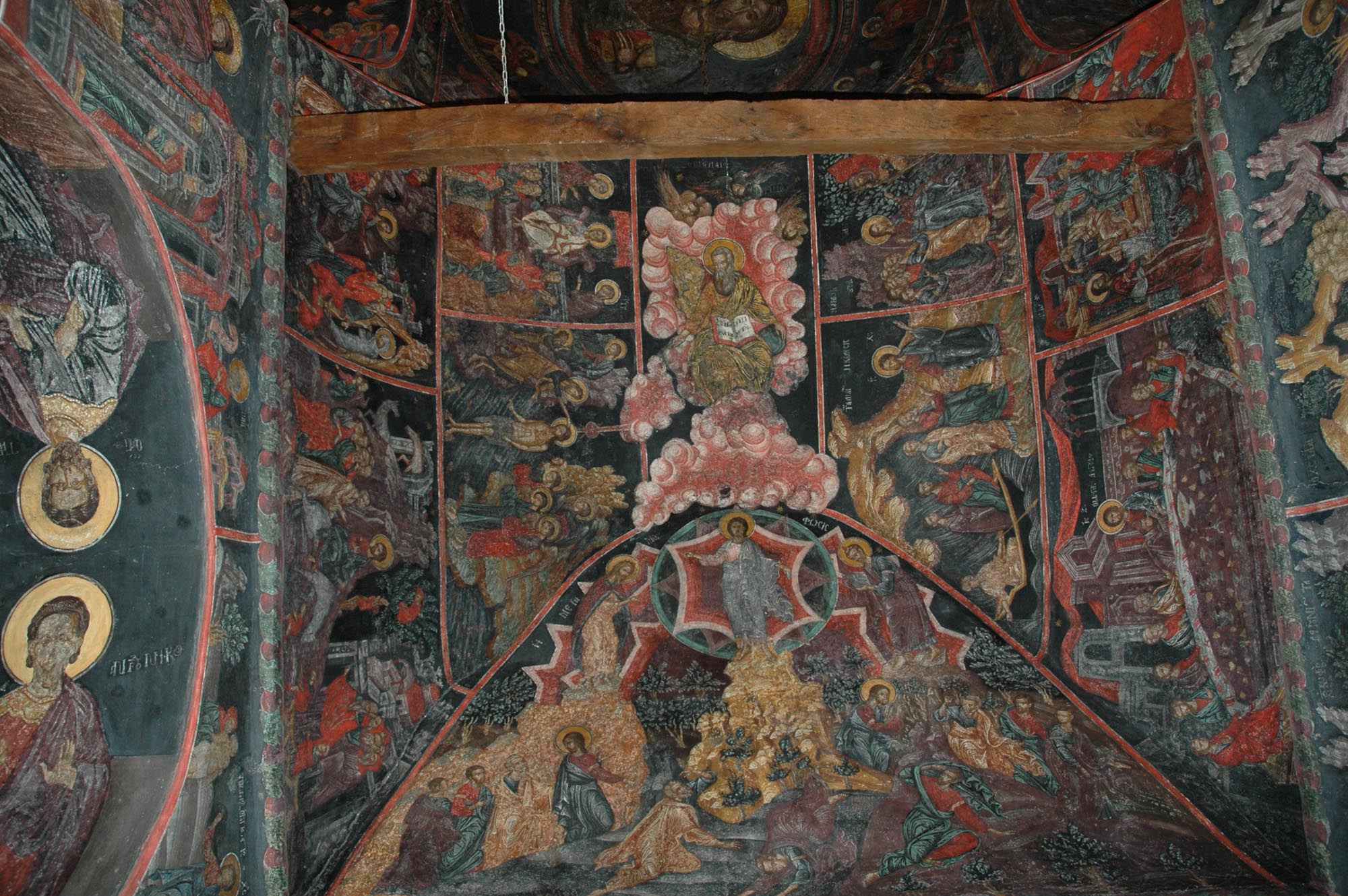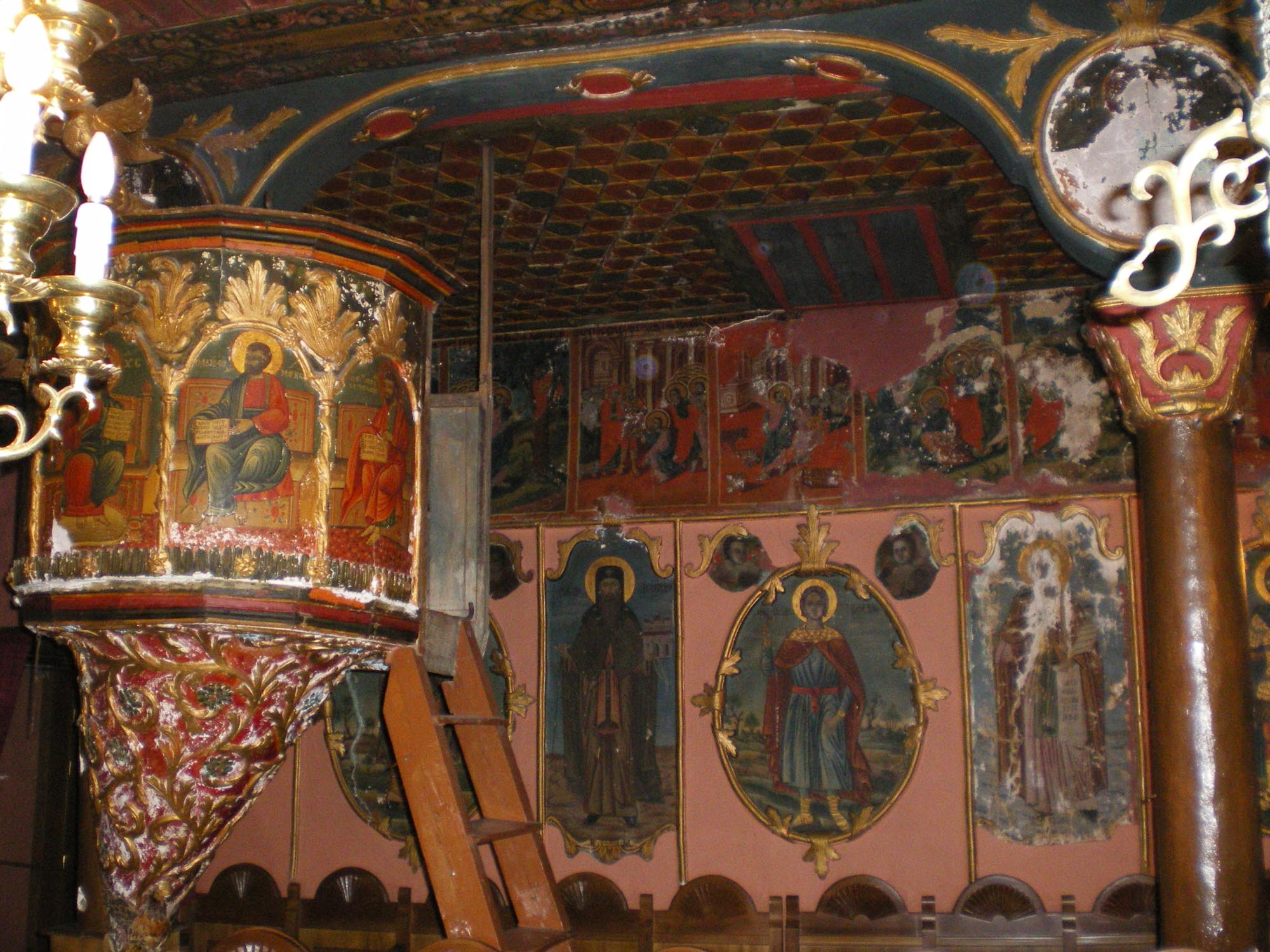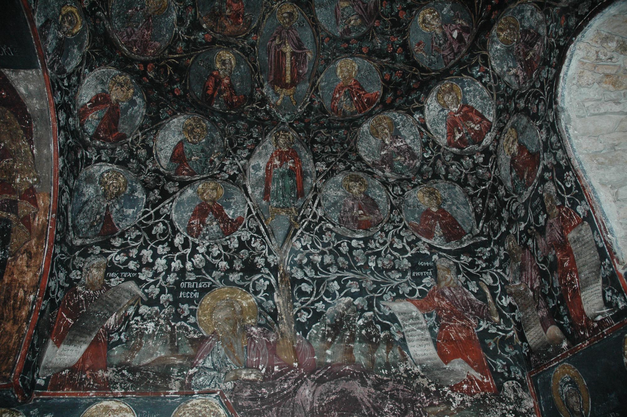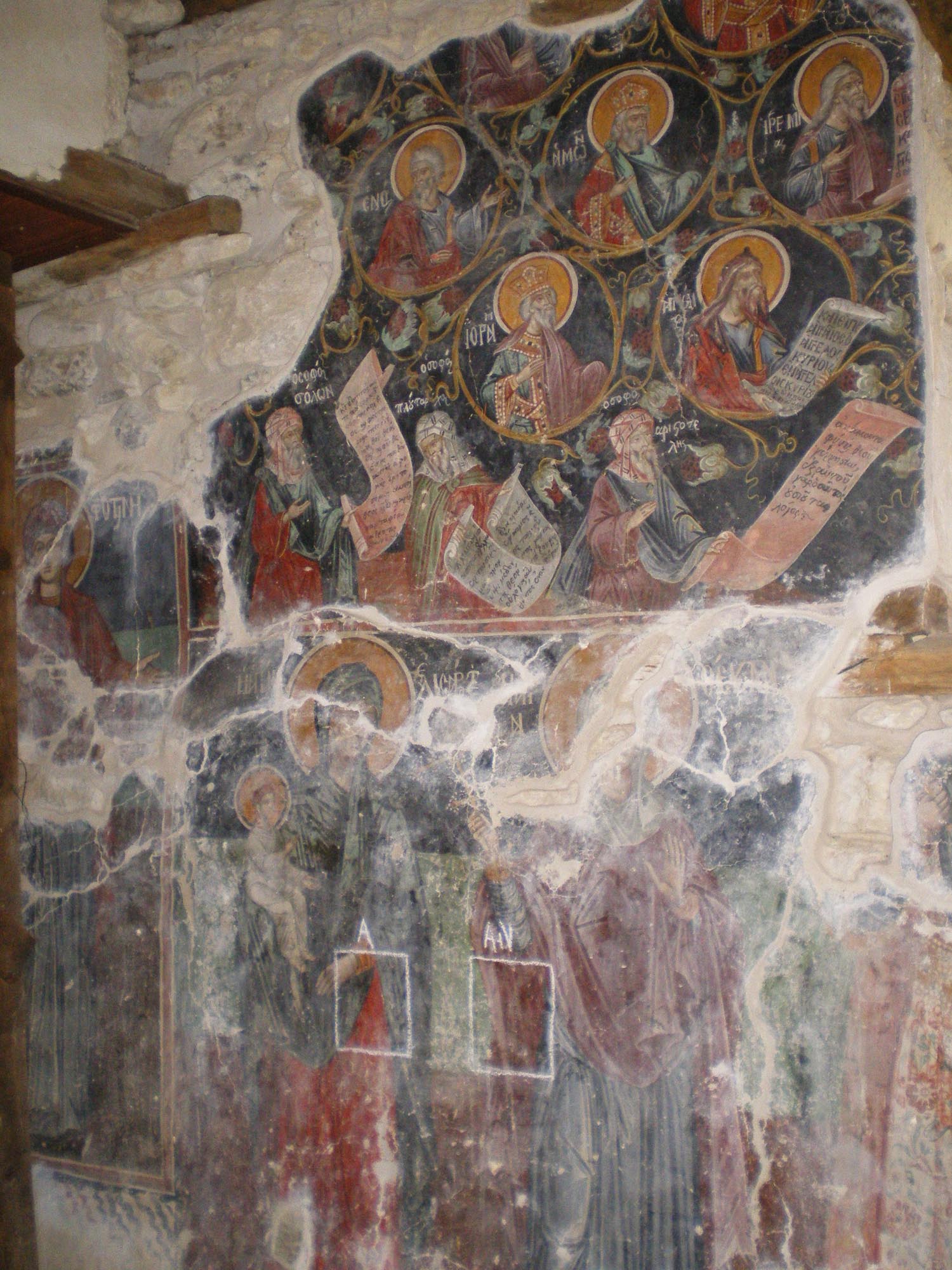 Το εσωτερικό του ναού είναι κατάκοσμο με τοιχογραφίες του 1679, ανάμεσα στις οποίες ξεχωρίζει η παράσταση της Ρίζας του Ιεσσαί, στην οποία περιλαμβάνονται μορφές αρχαίων Ελλήνων σοφών, του Πλούταρχου, του Αριστοτέλη, του Σόλωνα, του Θουκυδίδη, του Πλάτωνα και της Σίβυλλας. Κατά το 1898, ο Σιατιστινός ζωγράφος Χριστόδουλος Ζωγράφος ανέλαβε την επιζωγράφιση του εσωτερικού του ναού, ενώ παράλληλα φιλοτέχνησε την παράσταση της Θεοτόκου, της λεγόμενης «Αερικής», στο παρεκκλήσιο του ναού. Τοιχογραφημένοι είναι επίσης εξωτερικά ο βόρειος και ο νότιος τοίχος του ναού με παραστάσεις που έχουν φιλοτεχνηθεί το 1741, πιθανότατα από το εργαστήριο του Καπεσοβίτη αγιογράφου Αναστάσιου Ιωάννου Καλούδη και των αδελφών του, που την ίδια περίοδο εργάζονταν στους ναούς των Αγίων Μηνά, Βίκτωρα και Βικεντίου και του Προφήτη Ηλία.