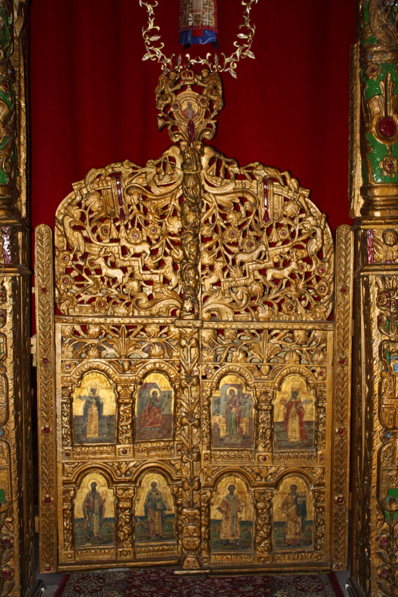 Εξαιρετικής τέχνης είναι ο ξυλόγλυπτος διάκοσμος του επιχρυσωμένου τέμπλου, η κατασκευή του οποίου συμπίπτει χρονολογικά με το έτος ανέγερσης του ναού, όπως και ο ξυλόγλυπτος διάκοσμος του δεσποτικού θρόνου, του άμβωνα και του προσκυνηταριού, που χρονολογούνται στα μέσα του 18ου αιώνα. Οι εικόνες του τέμπλου αποτελούν έργα του περίφημου κατά τον 17ο αιώνα εκπροσώπου της Κρητικής Σχολής Θεοδώρου Πουλάκη. Ιδιαίτερο κειμήλιο του ναού αποτελεί ο Επιτάφιος, που συνδυάζει ξυλόγλυπτο και ζωγραφικό διάκοσμο και αποτελεί έργο του Αναστάσιου Ιωάννου από τα Ιωάννινα (1741).