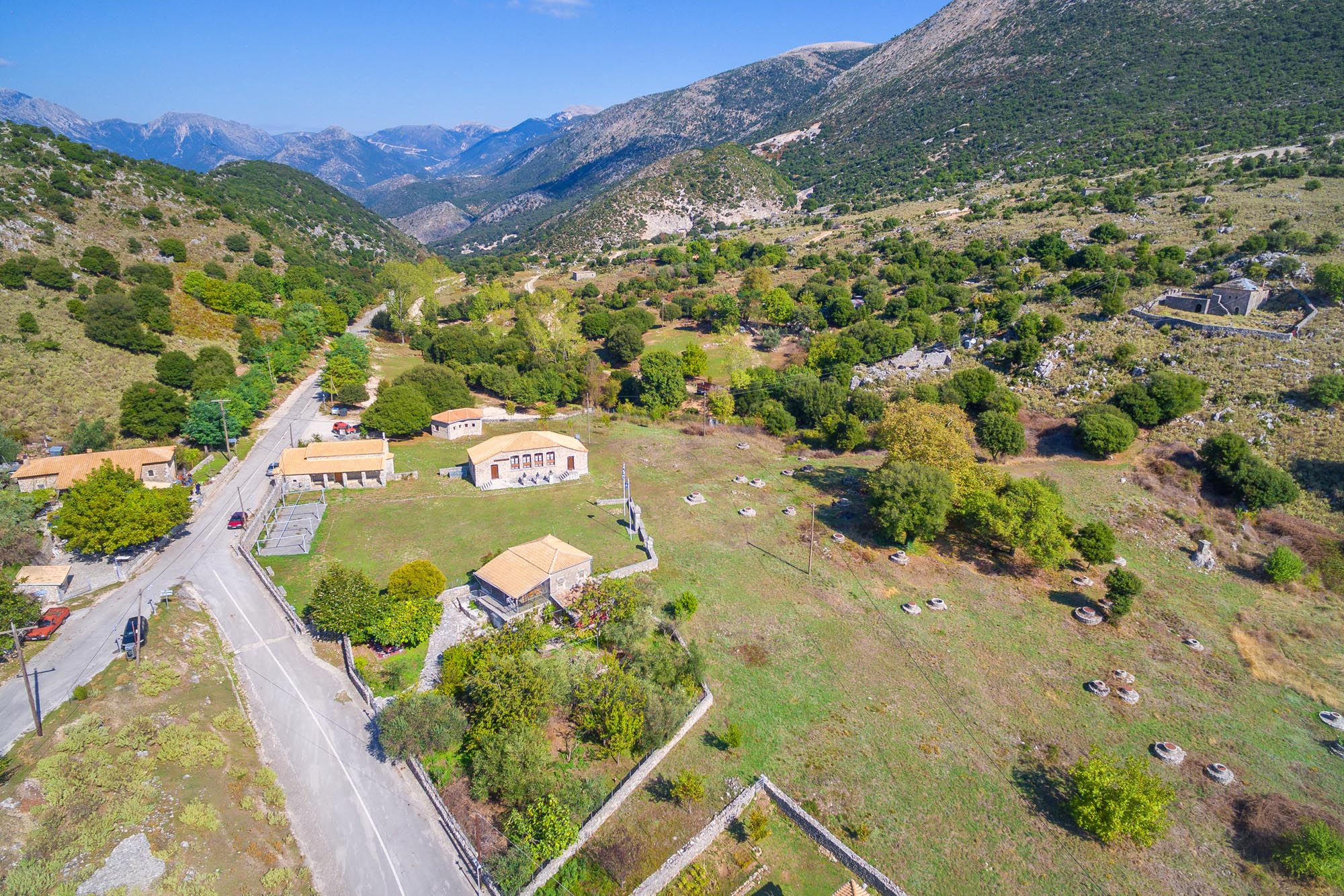 Οι κατοικίες των τεσσάρων οικισμών αναπτύσσονται ελεύθερα, σε αραιή κατά κύριο λόγο δόμηση. Η κατανομή τους υποδεικνύει ότι οι επιμέρους συνοικίες των οικισμών συγκροτούνταν με βάση τον χώρο που καταλάμβανε η κάθε φάρα. Πρόκειται για κτίσματα που διέπονται από ενιαίο πνεύμα ως προς τη μορφολογία και την κατασκευή, με τον ίδιο πάντοτε προσανατολισμό, με τη μεγαλύτερη διάσταση κατά τον άξονα Α-Δ. Πλήρως εναρμονισμένες με το βραχώδες και άνυδρο τοπίο, είναι κατασκευασμένες από τοπικά υλικά, με τοίχους από απλή αργολιθοδομή. Ικανοποιώντας τις λειτουργικές ανάγκες των ενοίκων τους με στοιχειώδη τρόπο, είναι απέριττα κτήρια, με απλή ορθογώνια κάτοψη και λιτές όψεις. Κυριαρχούν οι ισόγειες και οι ημιδιώροφες κατοικίες (όταν ο όροφος προστίθεται μόνο σε ένα τμήμα του κτηρίου), ενώ σπανιότερα απαντούν διώροφα κτήρια ή κτήρια με πιο σύνθετες κατόψεις. Ένα μικρό ποσοστό των διώροφων σπιτιών έχει τετράγωνη κάτοψη και ανταποκρίνεται στον διαδεδομένο αυτήν την περίοδο αρχιτεκτονικό τύπο που εφαρμόζεται σε πύργους και πυργόσπιτα (κούλιες).